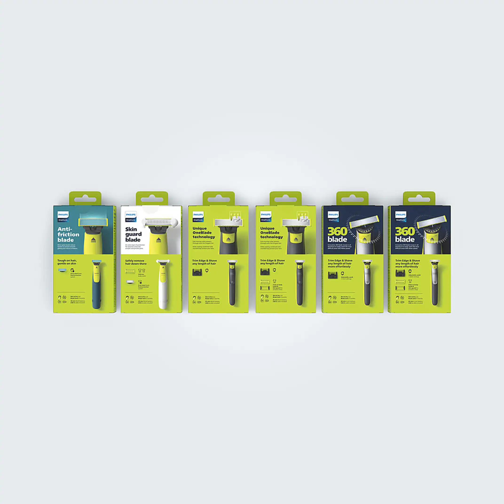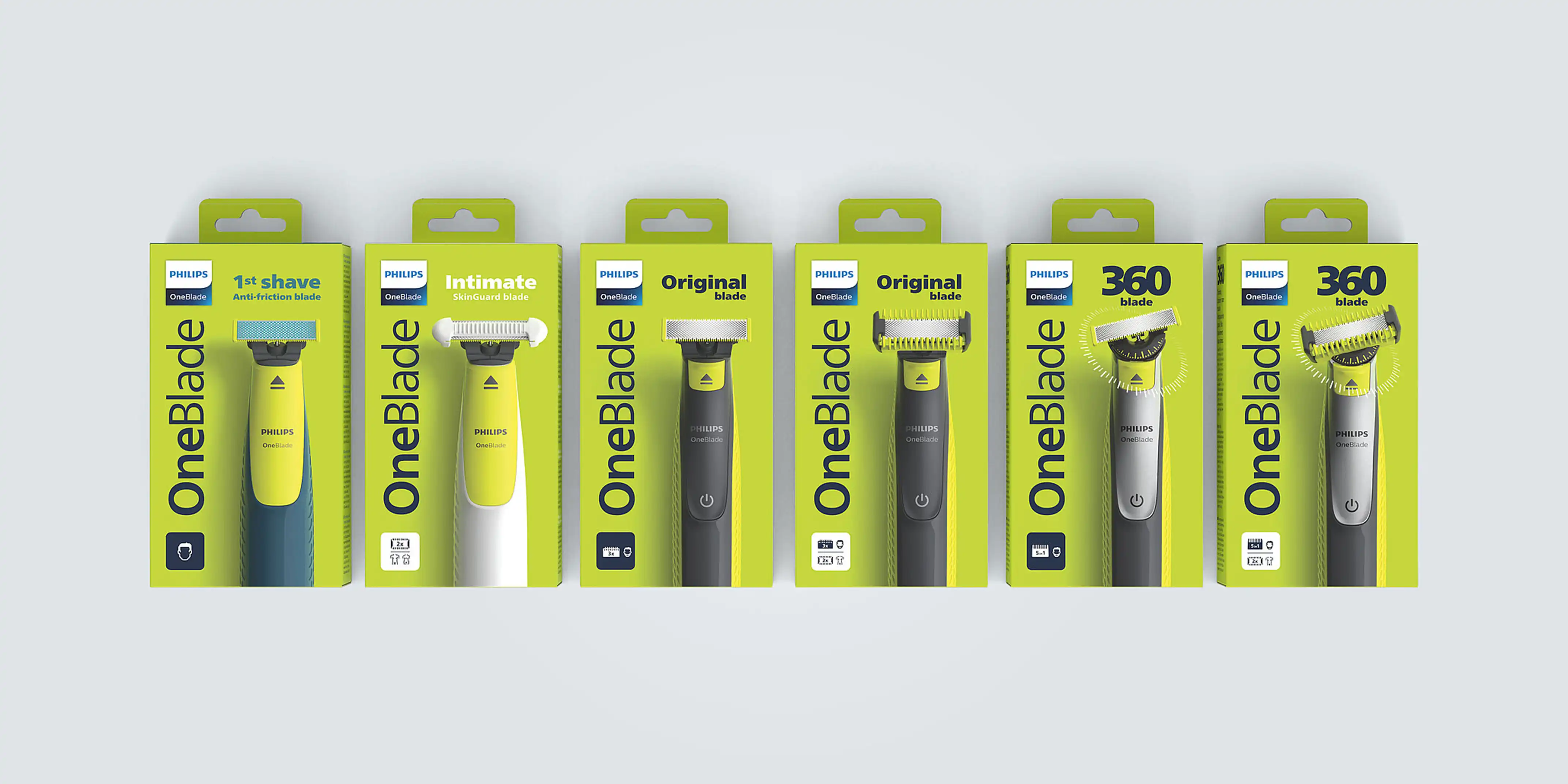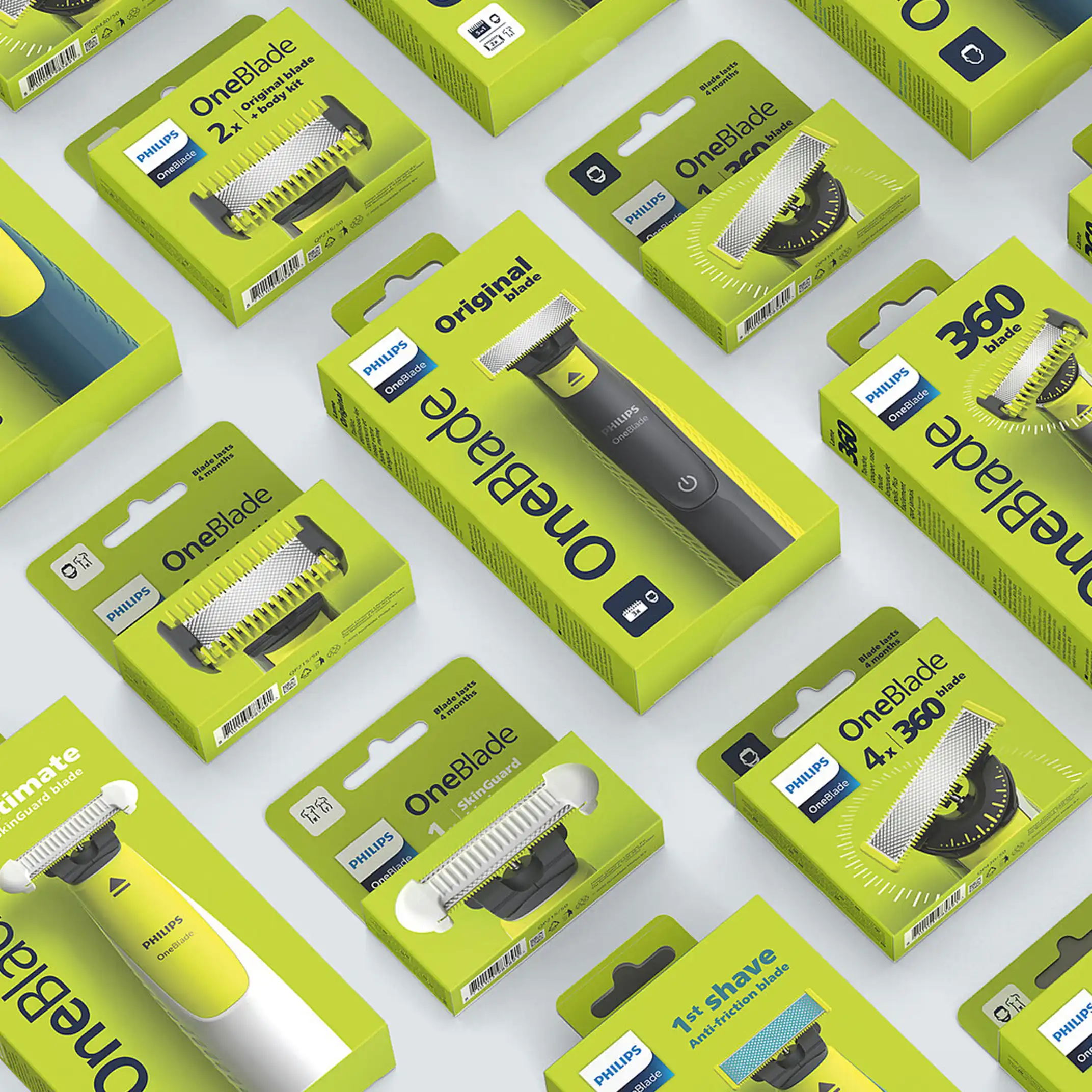 Philips was developing a new direction for OneBlade. I helped ideate and design for the new packaging family. The new packaging concept focused on the company’s sustainability goals: the number of parts used was reduced to a minimum, and no plastic was used. The reduced graphics on pack also provide the consumer with better orientation for a wide product range that was getting muddled and confusing. All of this was aligning with Philips’ new philosophy: Less is More. The new packaging structure also served as a great foundation for the signature OneBlade identity to stand out—on the shelf and online.