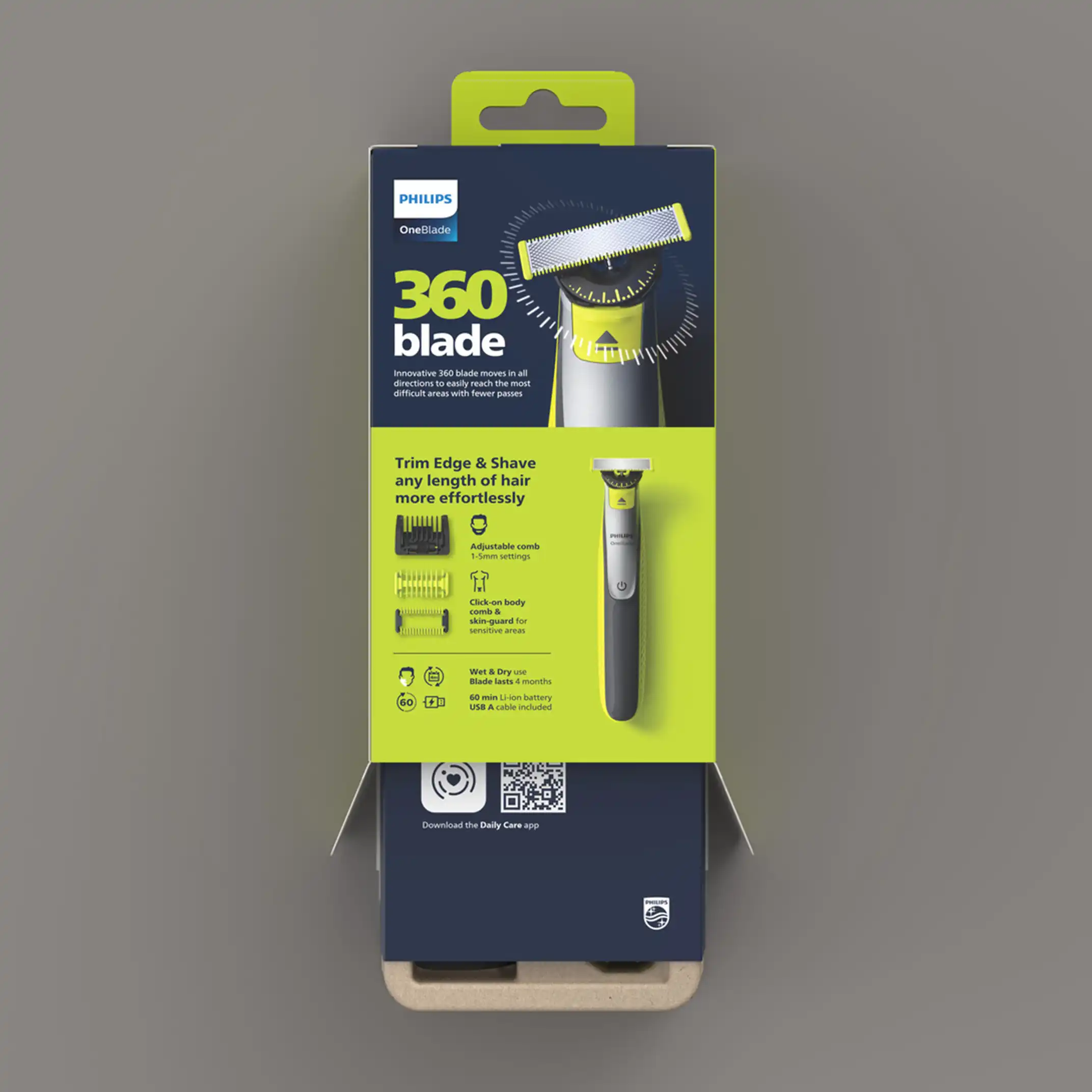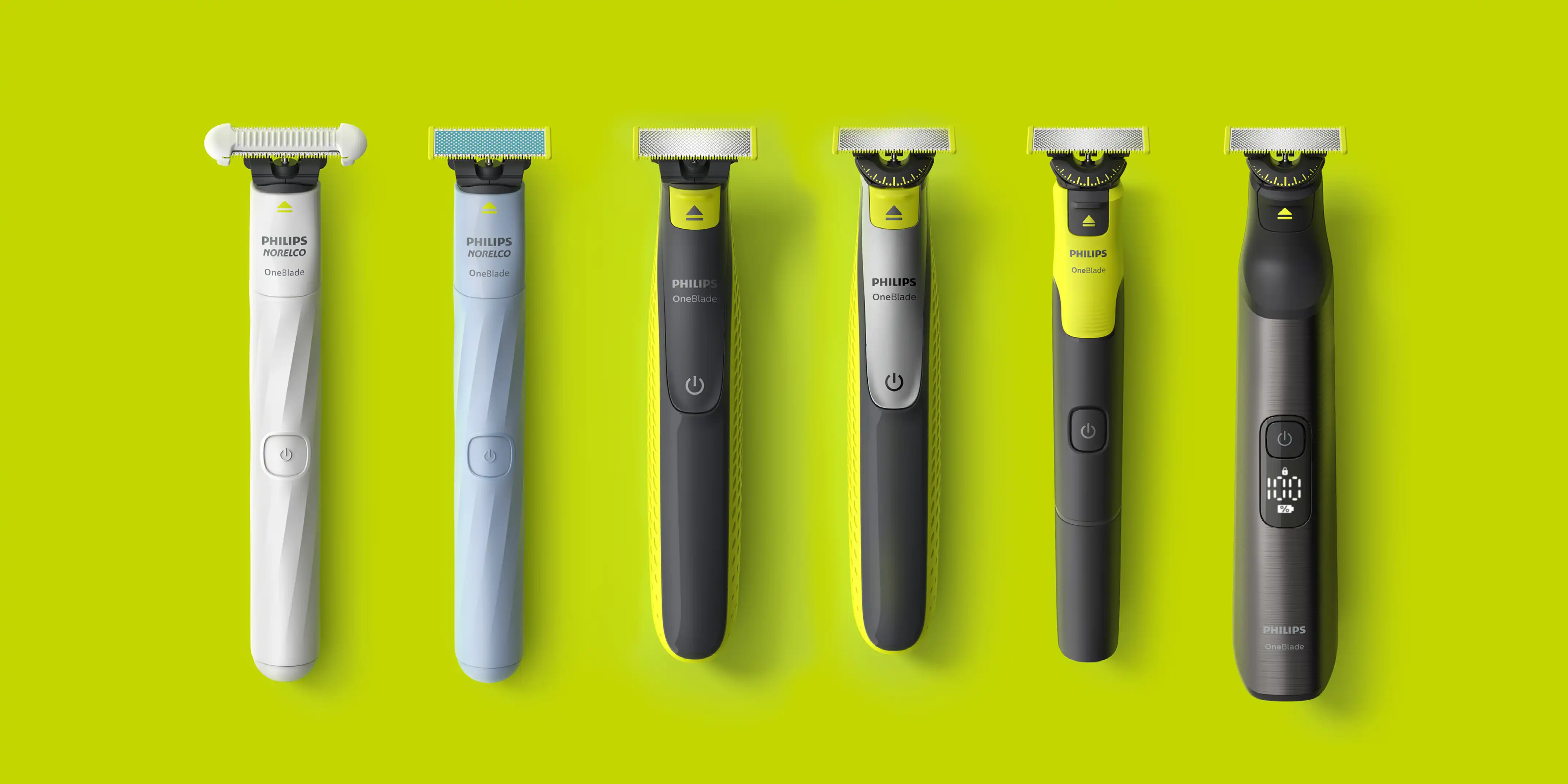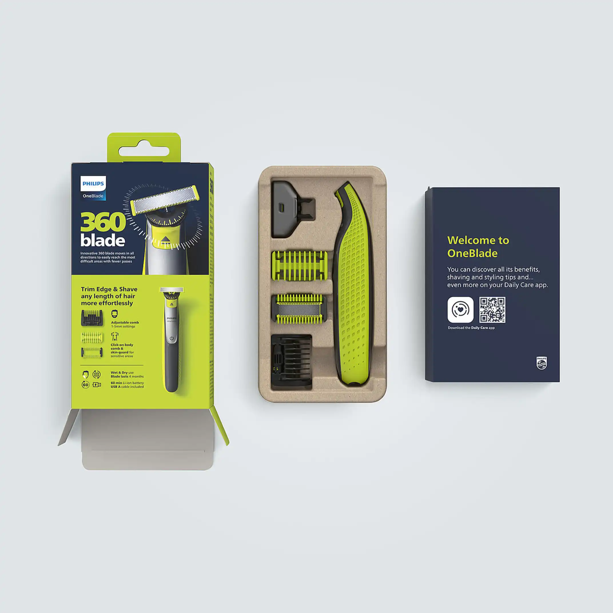 Philips was developing a new direction for OneBlade. I helped ideate and design for the new packaging family. The new packaging concept focused on the company’s sustainability goals: the number of parts used was reduced to a minimum, and no plastic was used. The reduced graphics on pack also provide the consumer with better orientation for a wide product range that was getting muddled and confusing. All of this was aligning with Philips’ new philosophy: Less is More. The new packaging structure also served as a great foundation for the signature OneBlade identity to stand out—on the shelf and online.